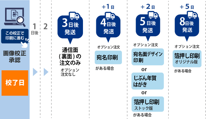 • 宛名面デザイン印刷のオプションを選んだ場合は、+2日(2,000枚以上は+3日)となります。(宛名印刷と宛名面デザイン印刷の両方を選択された場合は、それぞれの分日数がかかります。)