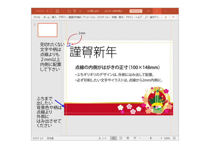 賀詞やお名前・ご住所など、切れてはいけないものは点線内に配置してください